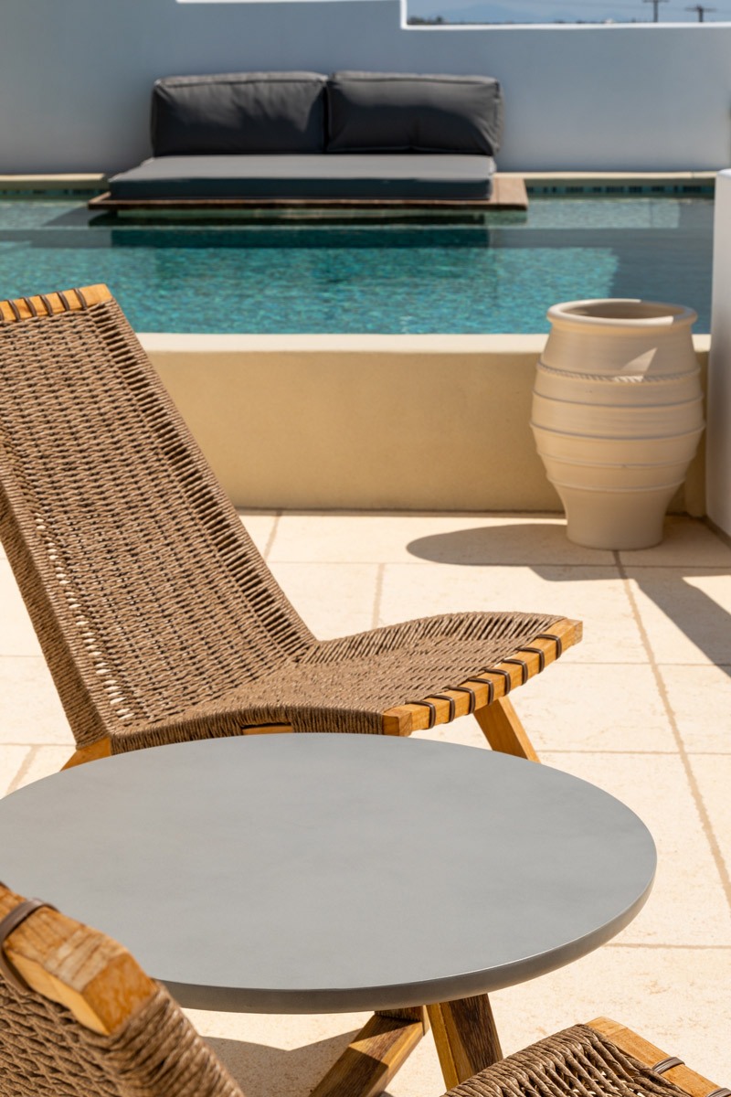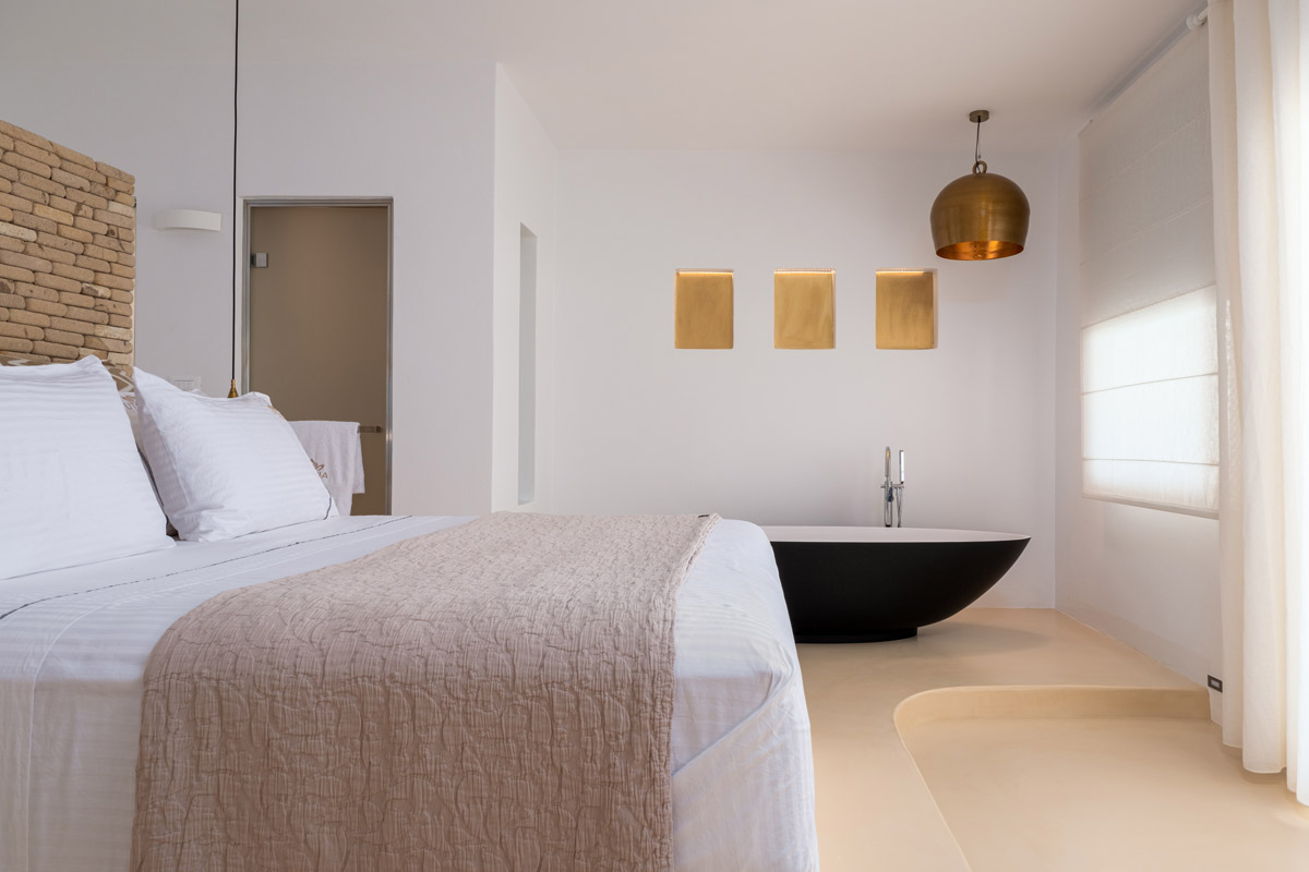 This suite features a large veranda with private infinity pool and panoramic sea view/sunset view. The views to the Aegean Sea offer a unique sense of the sunset.